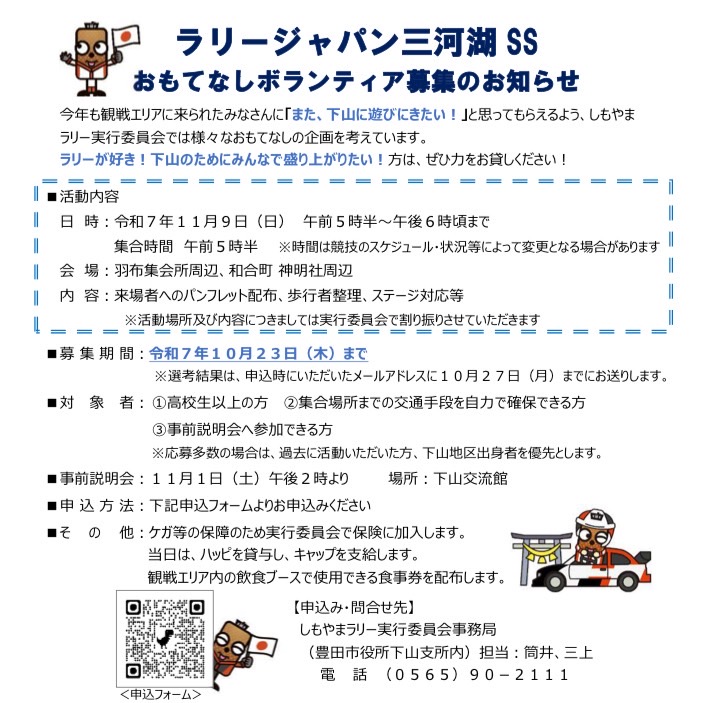 ボランティア募集 2025 10/03 お知らせ 2025年10月3日 三河湖SSでのボランティアを募集しています。参加希望者は申し込みフォームよりお申し込みください。 お知らせ よかったらシェアしてね! URLをコピーしました! URLをコピーしました! ラリー応援期間「しもやまラリーよってらっ祭、みてらっ祭」 この記事を書いた人 shimoyama.toyota 関連記事 ラリー応援期間「しもやまラリーよってらっ祭、みてらっ祭」 2025年10月3日 鯉恋フェスタへの出展 2025年4月30日 三河湖SSで購入可能な全グッズ 2024年11月23日 YouTube LIVEのお知らせ 2024年11月22日 田んぼ観戦エリアについて 2024年11月20日 三河湖SSで購入可能なオリジナルグッツ 2024年11月16日 三河湖SS ガイドブック 2024年11月14日 三河湖SS開催記念イベント「SHIMOYAMA QUEST」が始まります! 2024年11月1日 コメント コメントする コメントをキャンセルコメント ※ 名前 ※ メール ※ サイト 次回のコメントで使用するためブラウザーに自分の名前、メールアドレス、サイトを保存する。