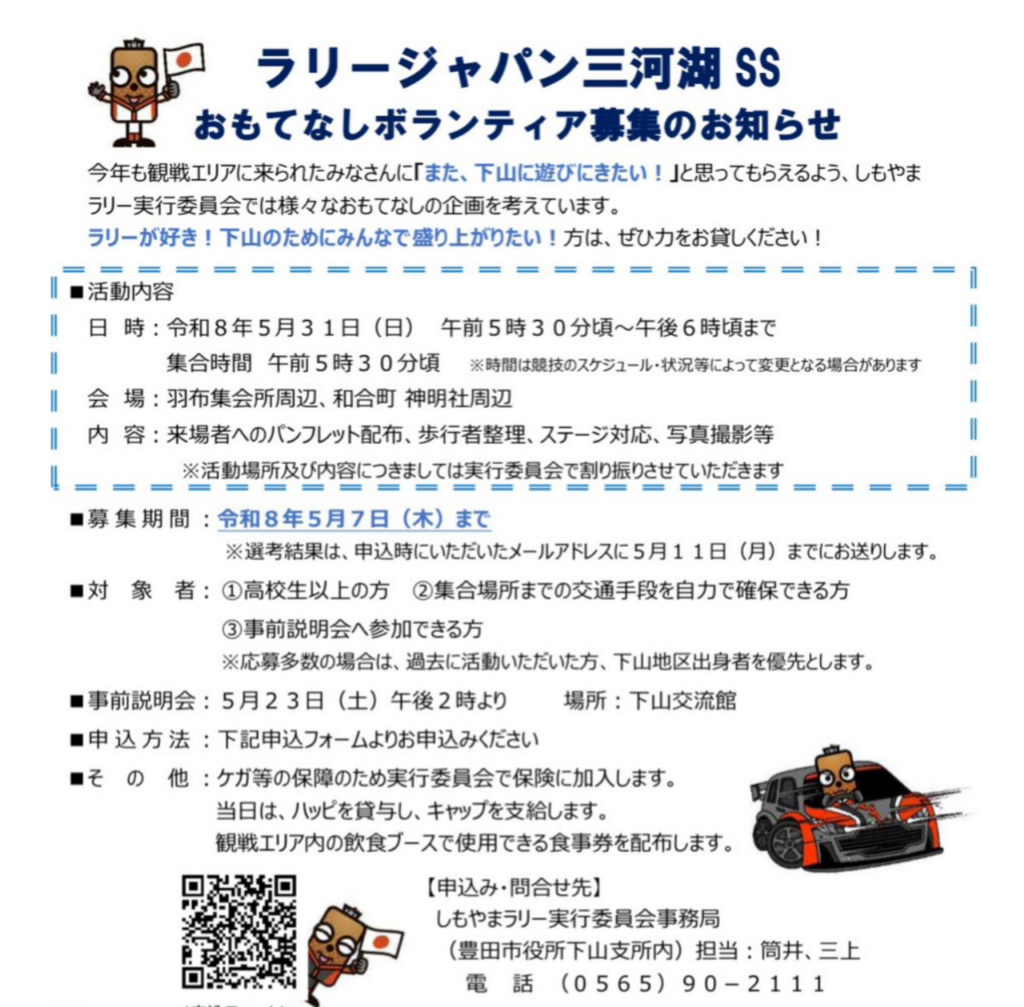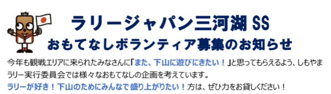 おもてなしボランティア募集のお知らせ 2026 4/11 お知らせ 2026年4月11日 ラリージャパン三河湖SSで、ぜひ力をお貸しください!こちらのフォームから申し込みできます。 お知らせ よかったらシェアしてね! URLをコピーしました! URLをコピーしました! 2025年も MikawakoSS YOUTUBE Live配信のお知らせ この記事を書いた人 shimoyama.toyota 関連記事 2025年も MikawakoSS YOUTUBE Live配信のお知らせ 2025年11月7日 2025年 オリジナルグッツ紹介、Tシャツ 2025年11月1日 2025年 オリジナルグッツ紹介、マフラータオル 2025年10月29日 三河湖SS ガイドブック 2025年10月20日 オリジナルグッズ第一弾 2025年10月11日 ボランティア募集 2025年10月3日 ラリー応援期間「しもやまラリーよってらっ祭、みてらっ祭」 2025年10月3日 鯉恋フェスタへの出展 2025年4月30日 コメント コメントする コメントをキャンセルコメント ※ 名前 ※ メール ※ サイト 次回のコメントで使用するためブラウザーに自分の名前、メールアドレス、サイトを保存する。